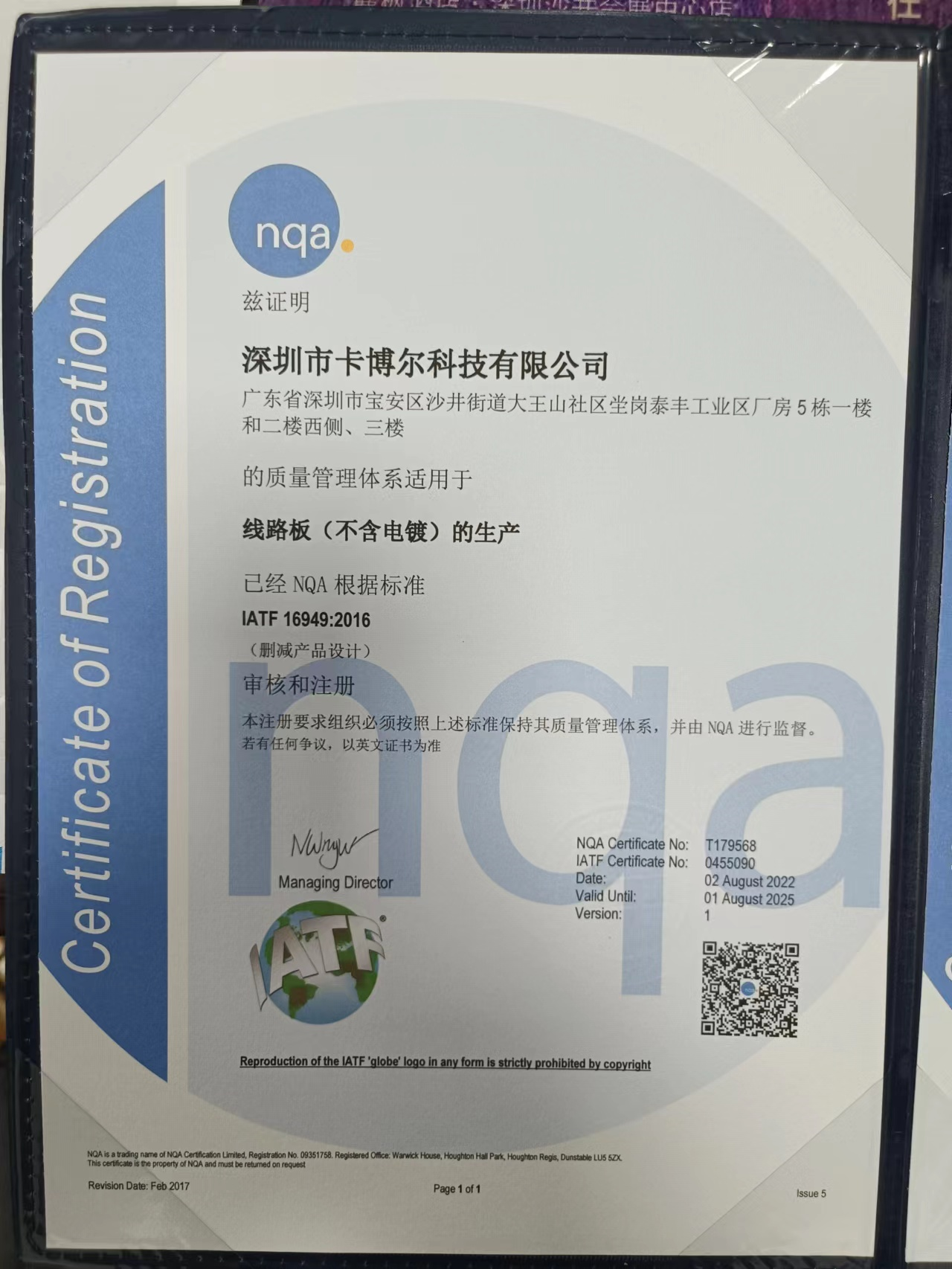 公司于2014年12月,通過ISO9001:2000質量認證和產品質量符合美國UL標準、ROHS標準、歐盟SGS無鉛產品認證。產品質量符合國際IPC-A-600G(CLASS2)、UL及ROHS環保標準。